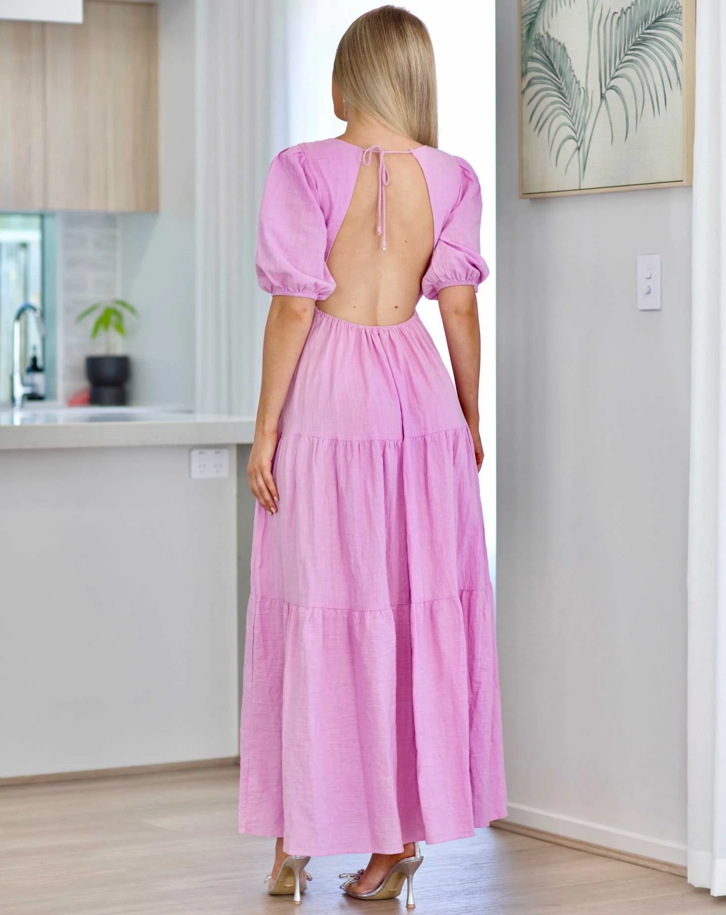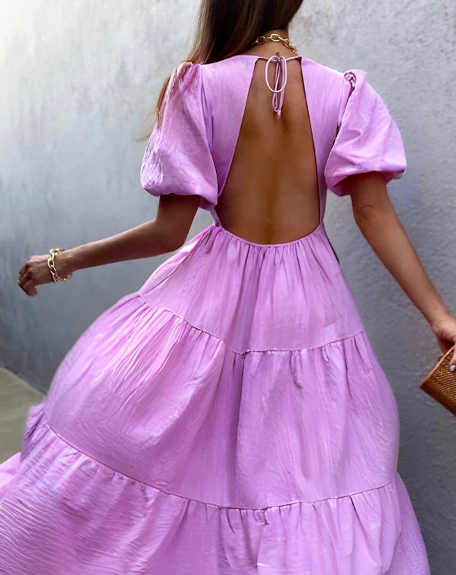 Our Asha Maxi Dress features a maxi length, short puff sleeves, v-neckline, ties on the back neck, and elastic on the waist with an open back. Lining and stretch throughout the garment.
