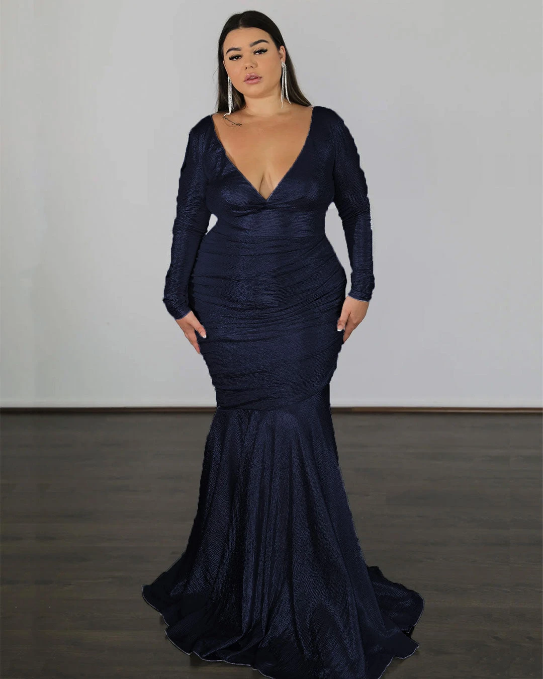 Unleash your inner glam with our Ashley Stretch Shimmer Dress. Featuring a wide low V neckline, full sleeves for comfort, and a stunning ruched skirt style.