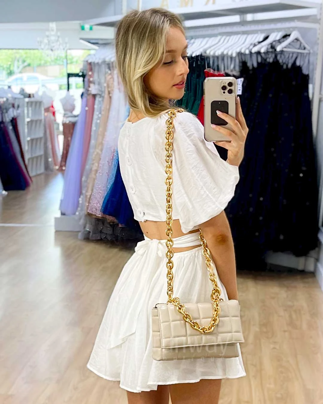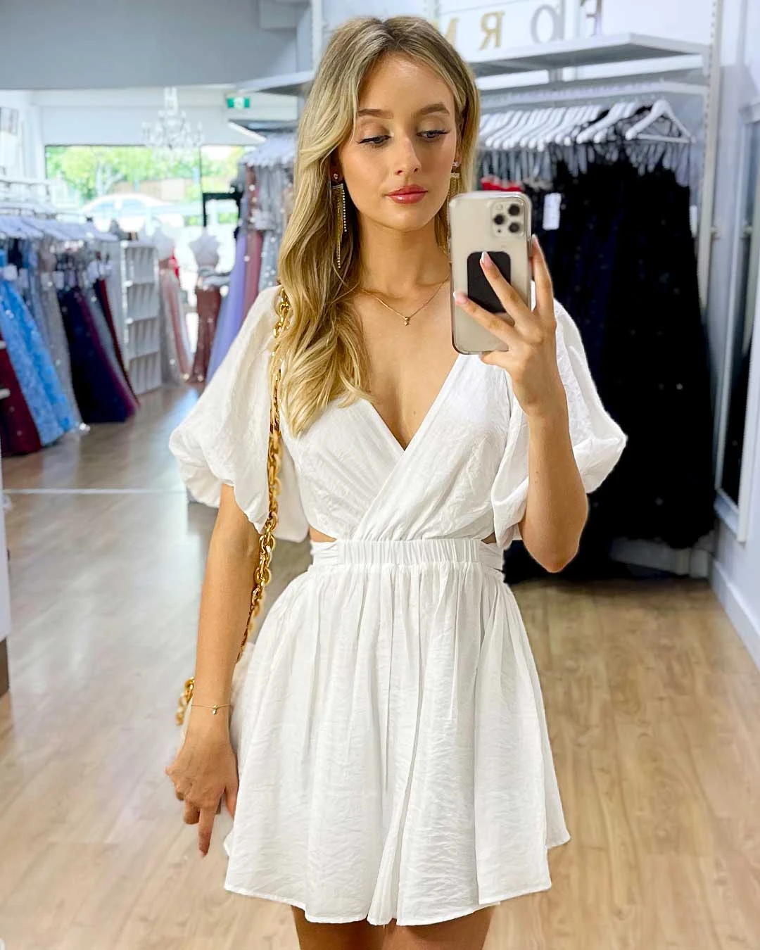 This seasons cut out waist trend comes in the cutest styles like our Blanca Mini Dress. Puffy short sleeves with waistband detail and gorgeous summary back bodice, completed with a lined flip skirt, makes this the perfect little casual party dress.