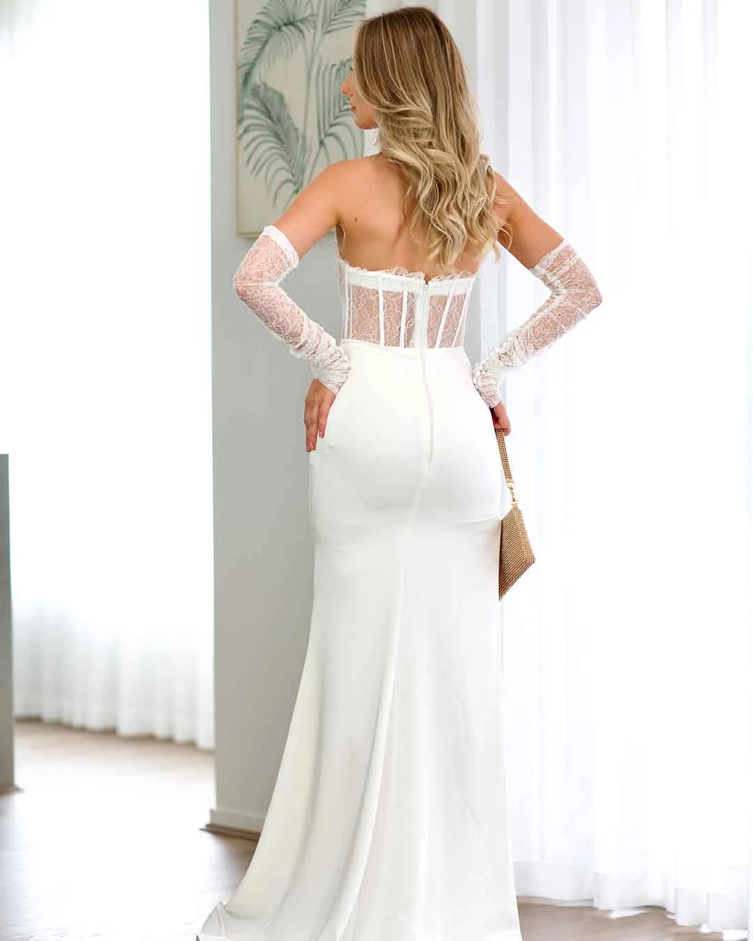 The new sexy Brigitte Strapless Corset Gown by Nicoletta features mermaid style, strapless corset bodice, detachable long sleeves and a leg split. Feel like a movie star!