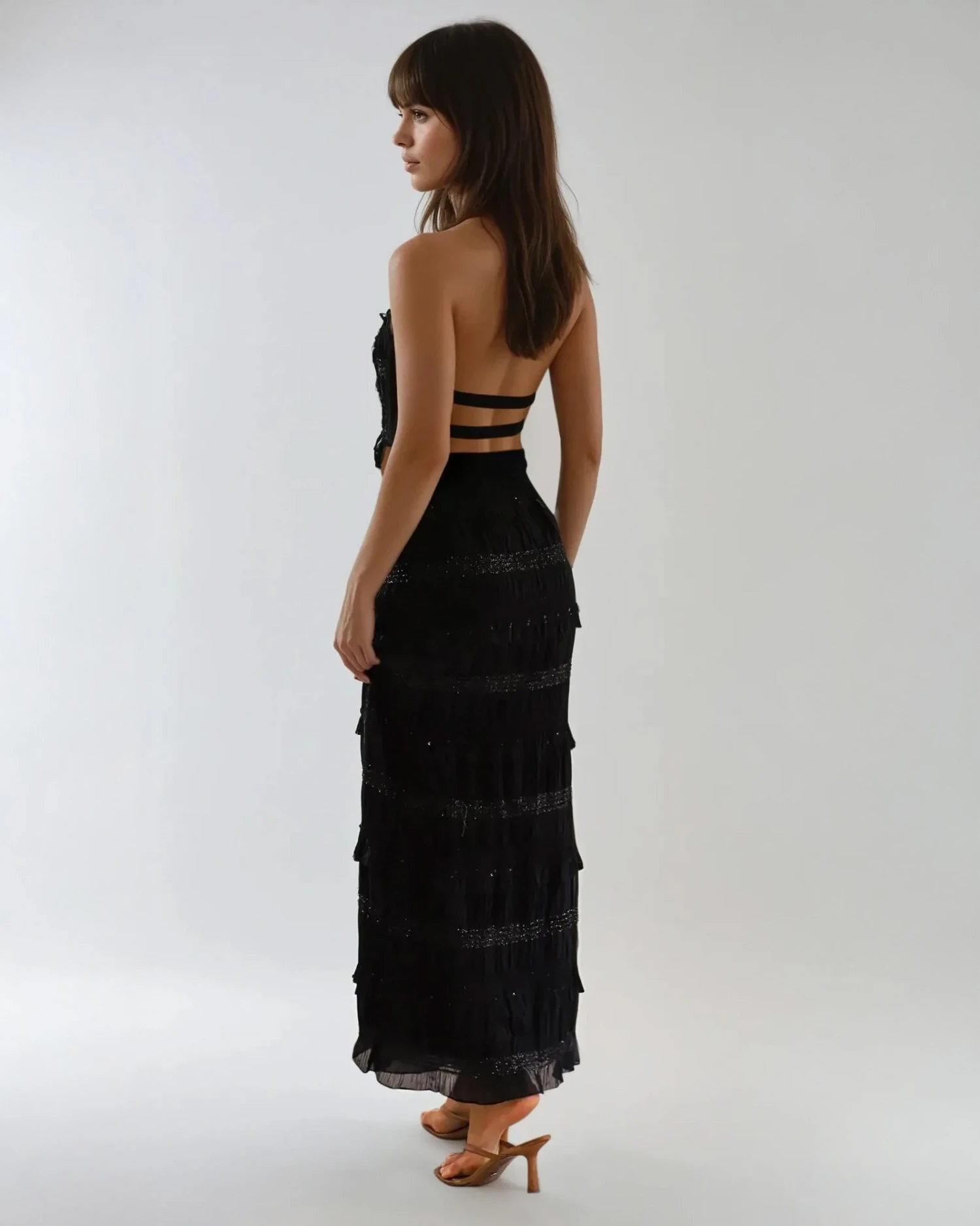 Make a statement with the stunning Calliope Maxi Top and Skirt Set, designed for the modern trendsetter. Perfectly balancing elegance and allure, this two-piece set is your go-to for any occasion where you want to turn heads.