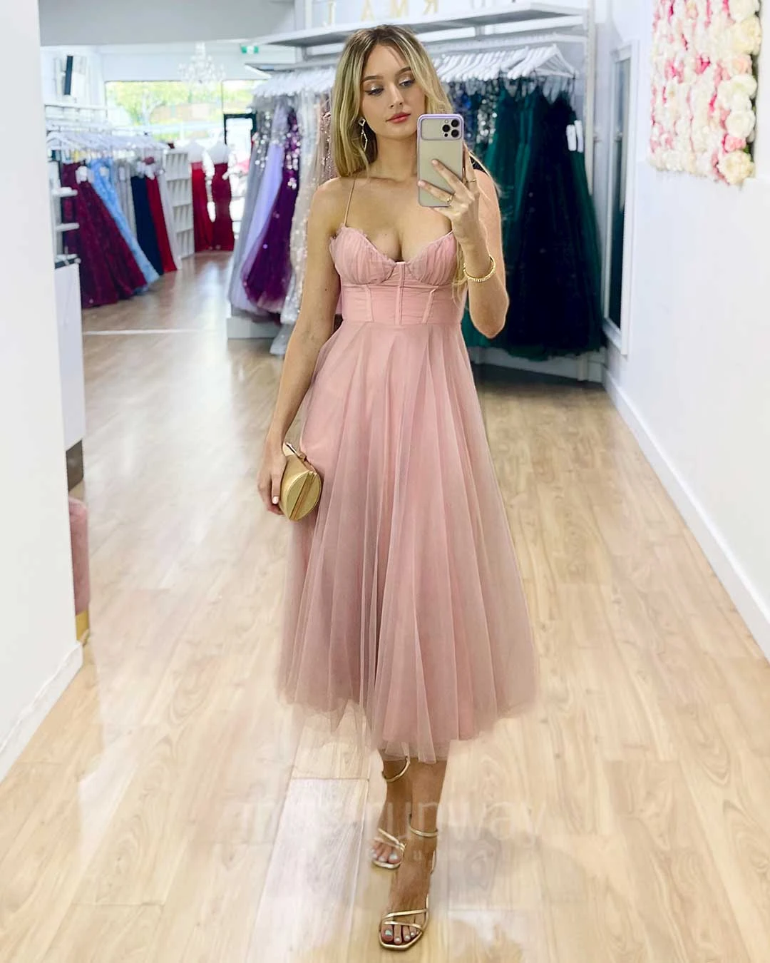 The new Carrie Midi Dress is so special. Carrie Bradshaw vibes featuring midi length, corset top, tulle gown and cross back. Be ready to feel like a princess!