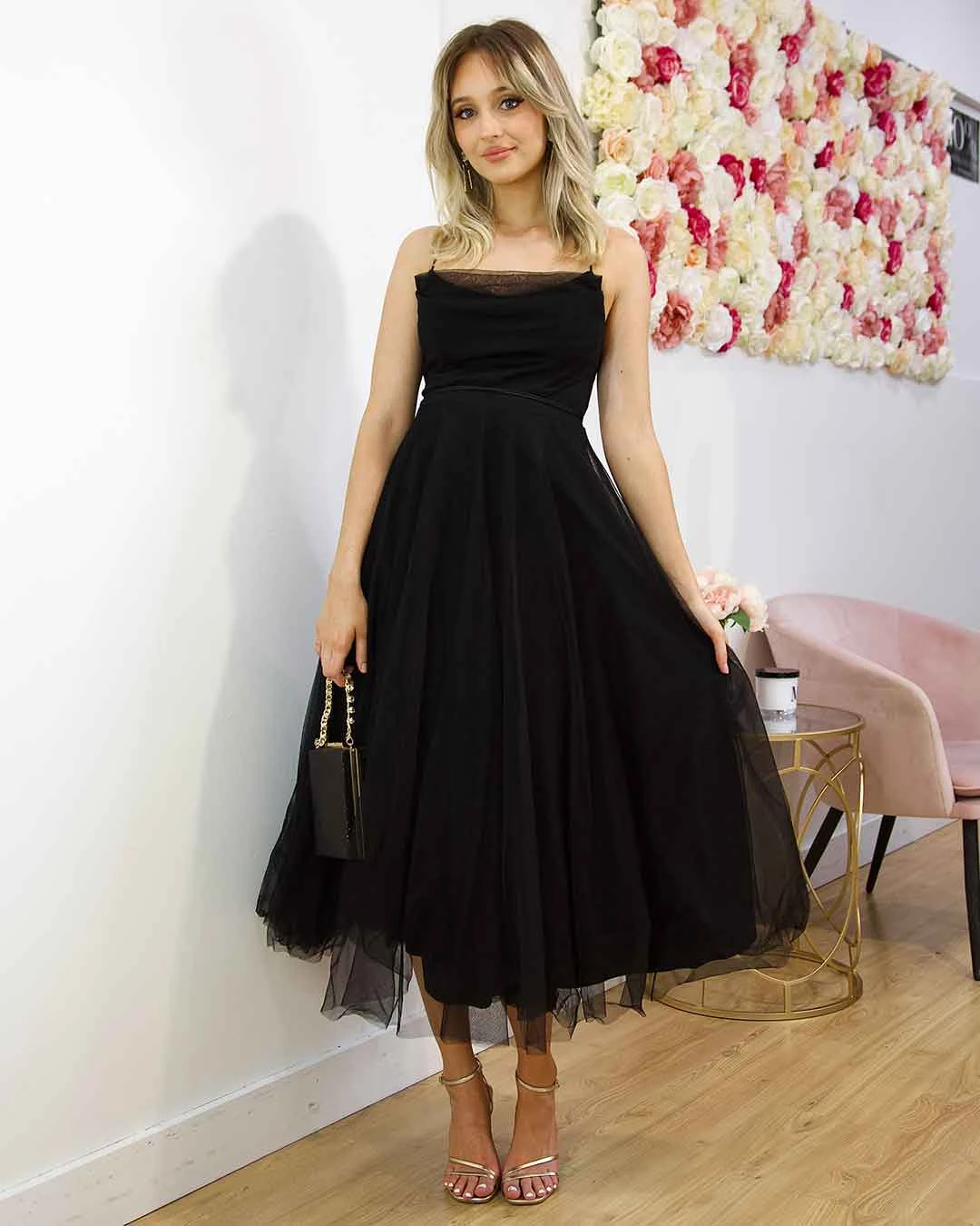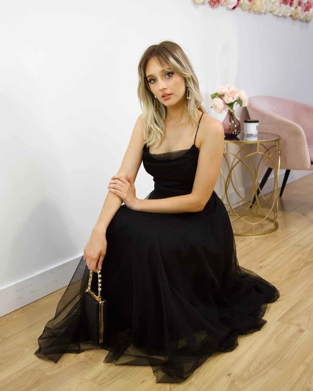 The new Charlotte Midi Dress is so special. Similar to our best seller Carrie Midi Dress, features midi length, Cowl neck, tulle gown and lace up back. Be ready to feel like a princess!