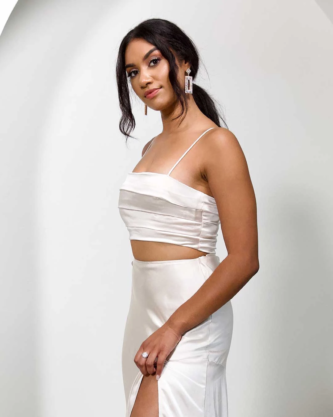 Our new Cindy Satin Top features a cropped cut, thin adjustable straps and centre back zip. Complete the look with our Cindy Satin Maxi Skirt. Â
