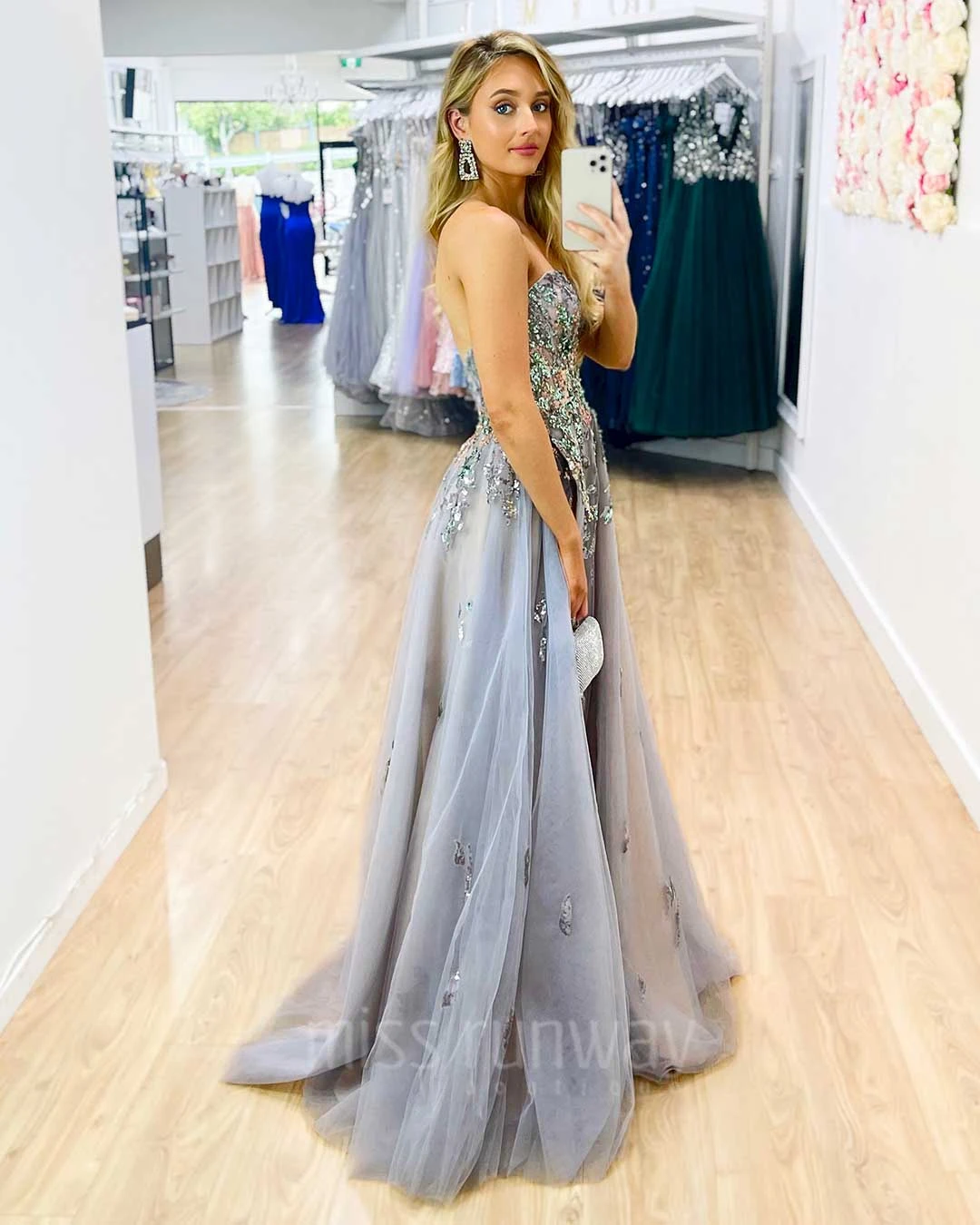 Our Delilah Beaded Gown is the ultimate jaw dropping formal gown. A bodice encrusted with jewels and crystals, with beautiful flowing layers of tulle and a high leg split. This gown is bound to have every girl feeling like a modern day Cinderella.Â