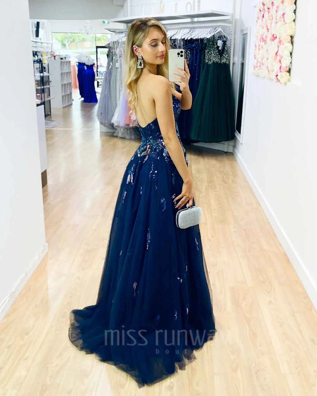 Our Delilah Beaded Gown is the ultimate jaw dropping formal gown. A bodice encrusted with jewels and crystals, with beautiful flowing layers of tulle and a high leg split. This gown is bound to have every girl feeling like a modern day Cinderella.