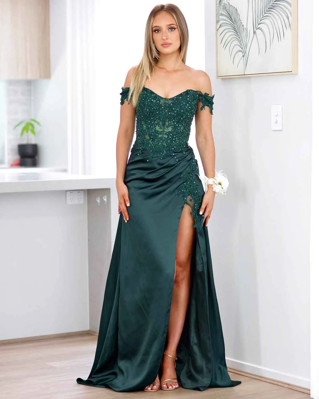 Get ready to dazzle and steal the spotlight with the gorgeous Eliza Beaded Lace Corset Gown, specially designed for the trendsetter in you! Made from luxurious beaded lace applique and stretch satin, it combines elegance with comfort. The sheer tulle bodice adorned with intricate lace applique features off-shoulder straps, adding a touch of femininity and charm. The fitted skirt is designed to turn heads. With ruching and a draped leg split, it creates a stunning silhouette that accentuates your curves and adds a touch of allure. The detailed lace insert adds a hint of romance and adds an extra wow factor to this already glamorous dress.