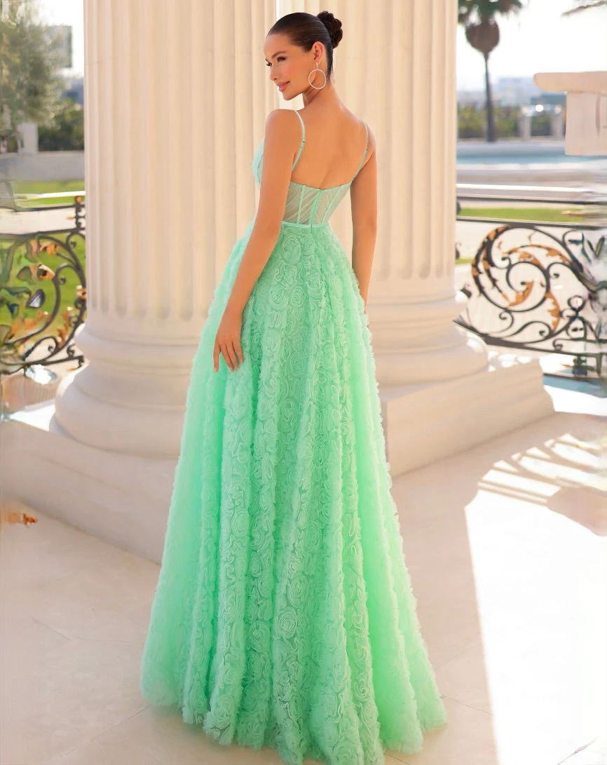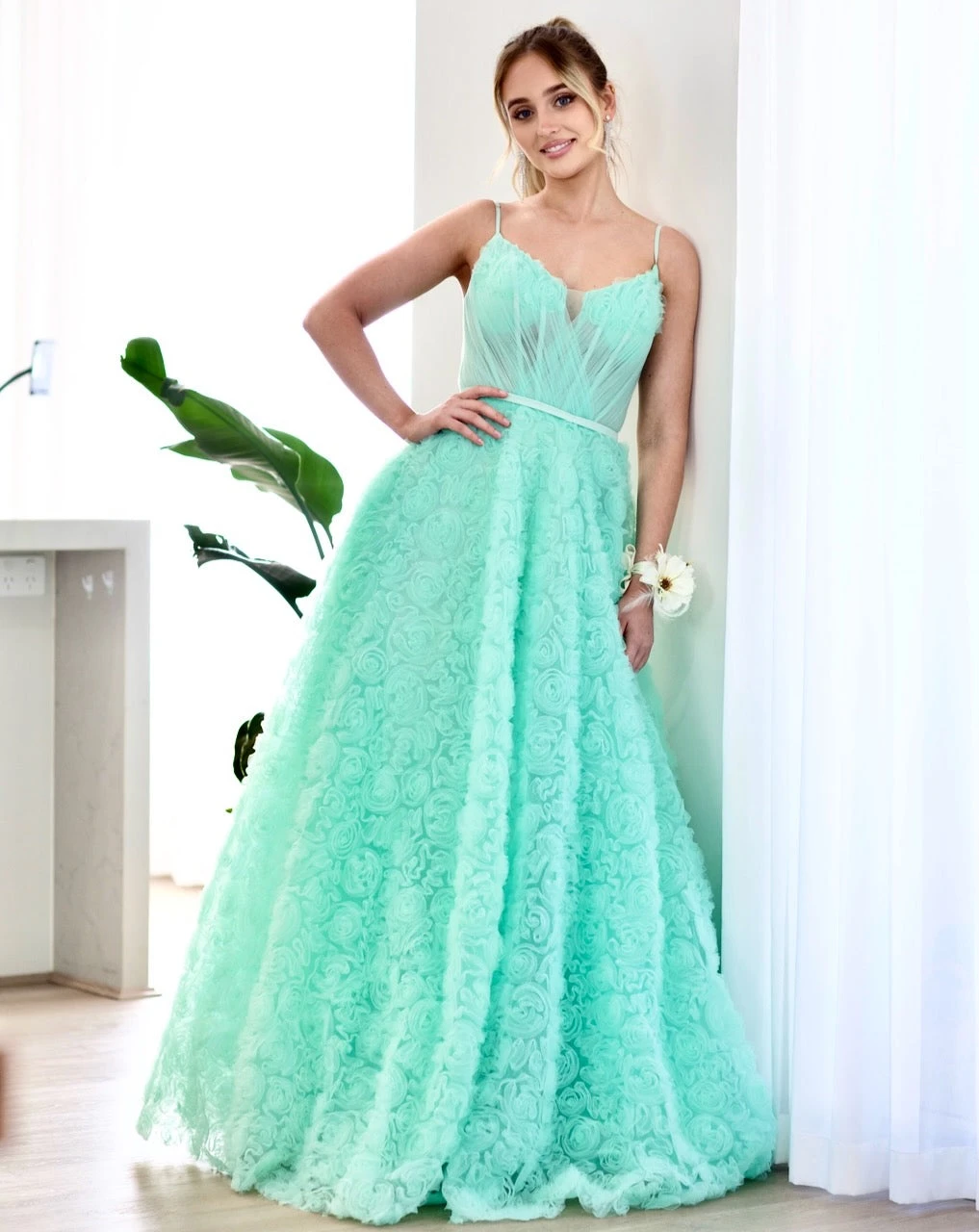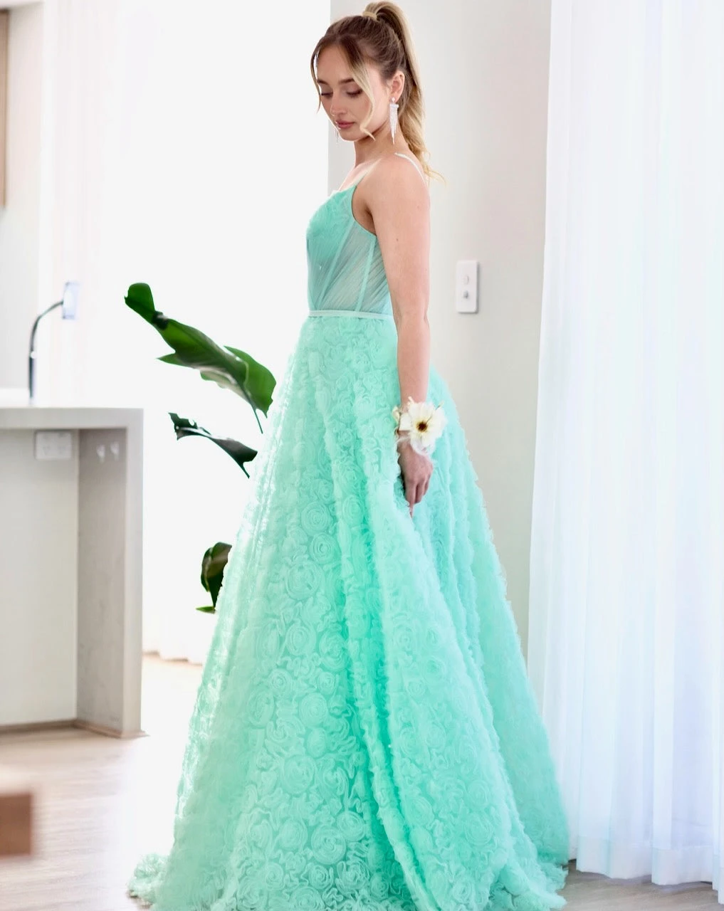 Elegance blooms in this Elodie Floral Gown. Featuring 3D floral fabric. The scoop neckline is complemented by diamond-embellished spaghetti straps, while a mesh layer adds a subtle silhouette on top, creating a dreamy, flowing effect.