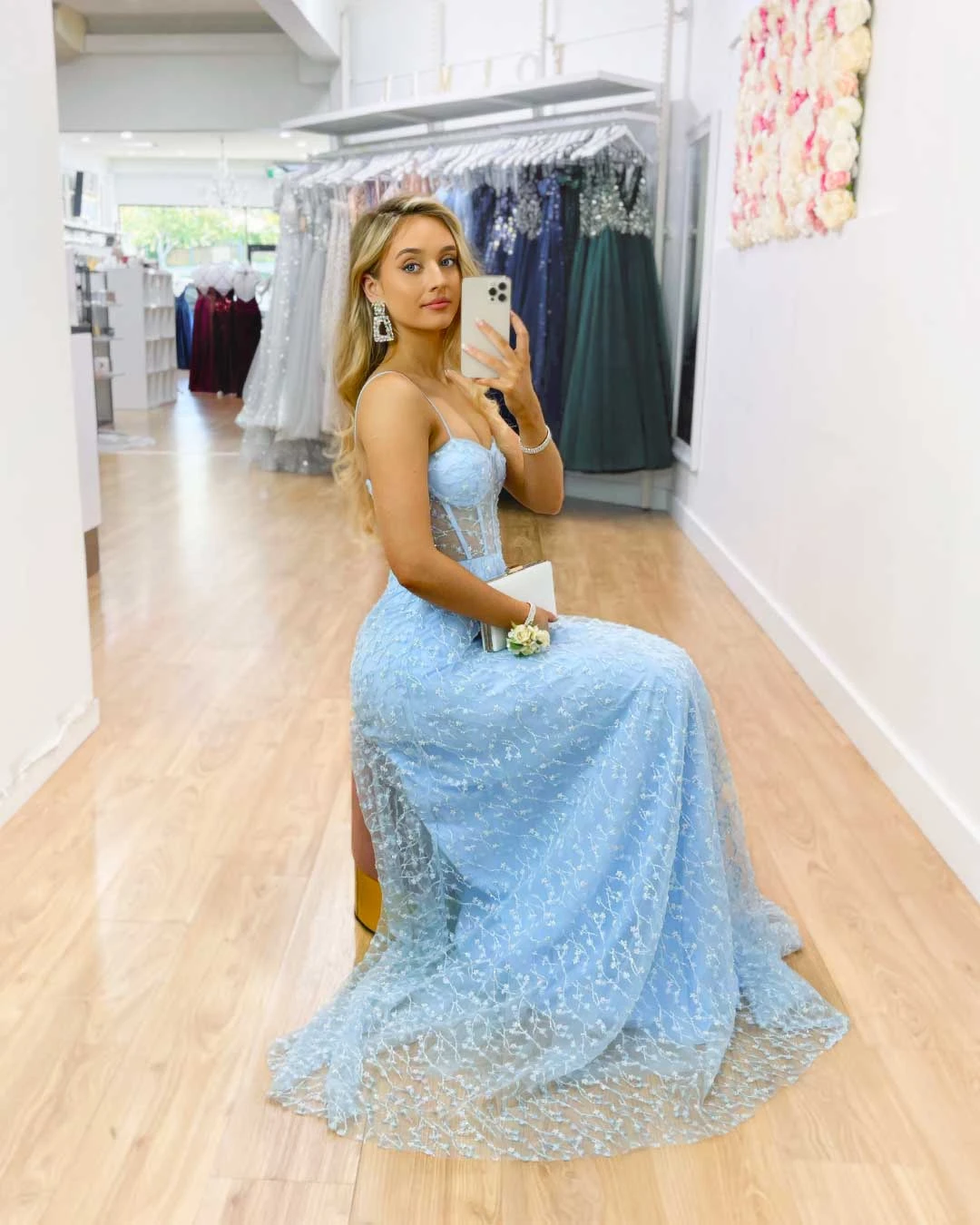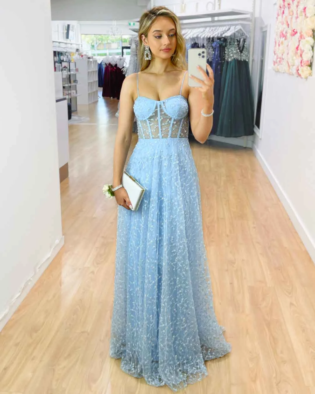 The sheer corset style bodice of this modern day Cinderella style Emily Beaded Gown is a must for your next formal affair. Glide as you dance all night long on the dance floor with a full flare skirt that will capture the light and have you shining bright like a diamond.