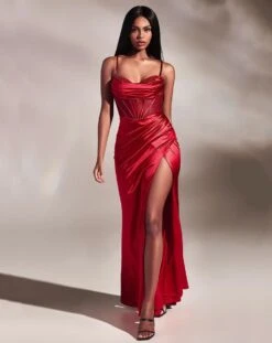 Show off your best features with the stunning Eugenie Satin Corset Gown! Crafted from the luxe satin, this exquisite gown clings to your figure and provides a tantalisingly glamorous look. The sheer boned bodice is detailed with elegant pleats, crystal beading, and a gathered waistline that flatters every inch of you. For an added touch of drama, the leg slit catches the eye, while the lace up corset back helps to show off your beautiful silhouette. Perfect for prom night or other special occasions, you will be sure to turn heads in this deliciously sexy corset satin gown.