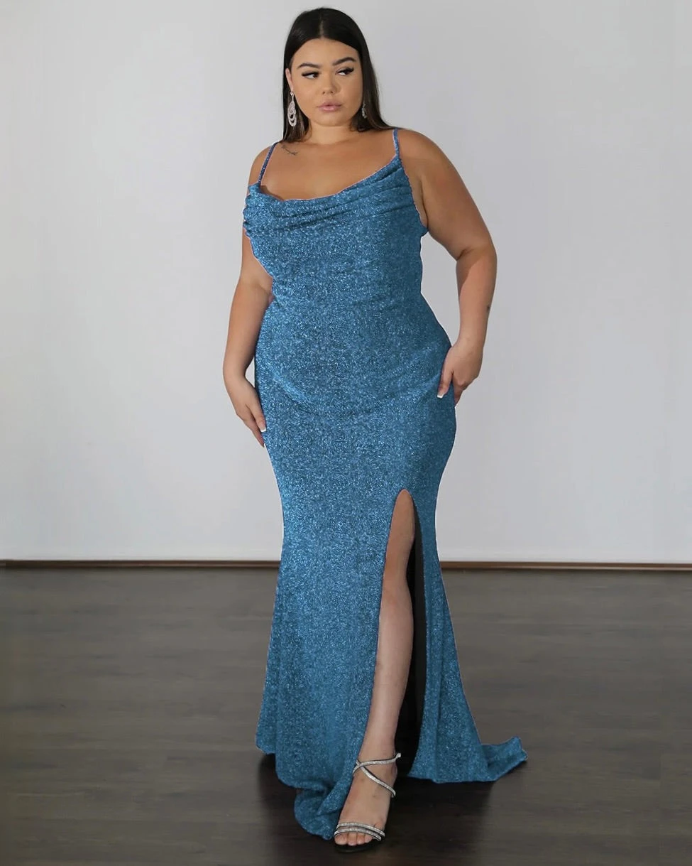 Model Ryley is wearing size 18 ‘Issy Sapphire Metallic Jersey Dress’