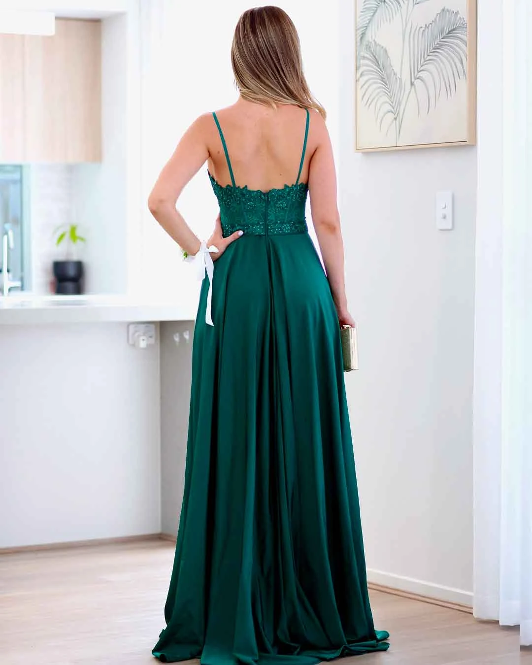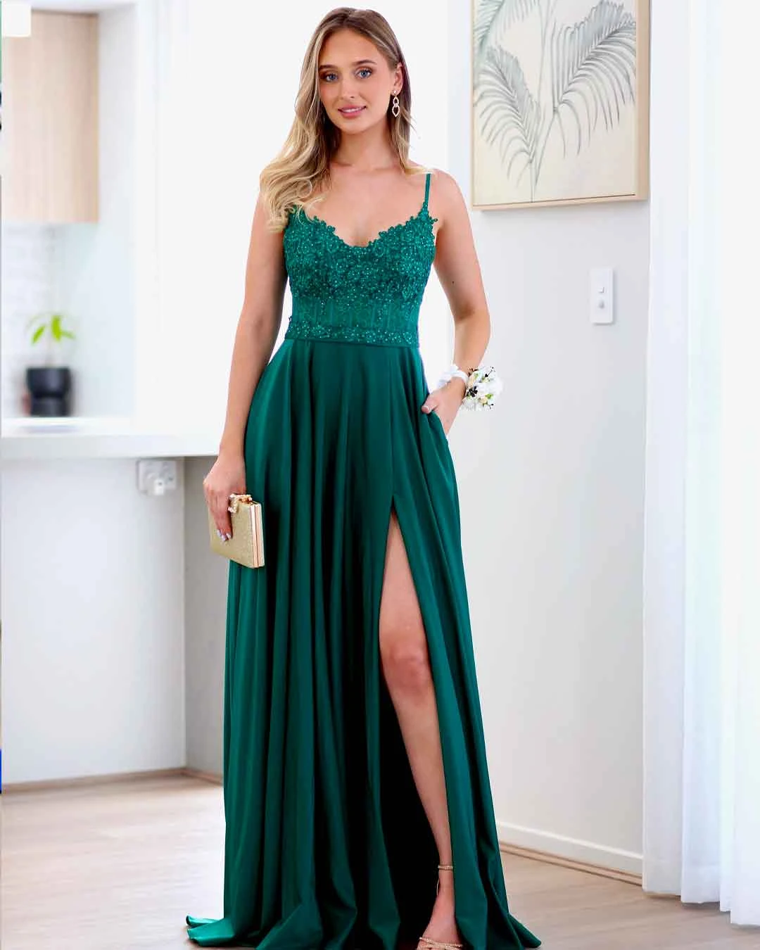 Fall in love with this stunning Joey Gown. The must have corset style bodice features an absolutely beautiful neckline with lace and beaded detail. Enhance your womanly curves with the cinched in waist and flowing skirt with sexy side front slit. Prepare yourself to have all eyes on you! We’re in love and you will be to.