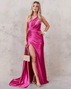 Katherine One Shoulder Satin Gown – Fuchsia