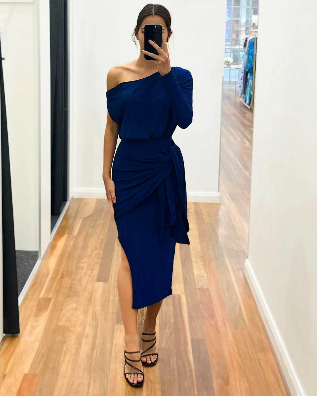 Step into elegance with our Merlow Glitter Midi Dress, a luxurious piece that radiates sophistication. Boasting a chic one-sided long sleeve and a flattering boat neckline meant to be worn off-shoulder, this dress is adorned with a charming tie-front waist feature. Elevate your style and make a lasting impression with this stunning ensemble.