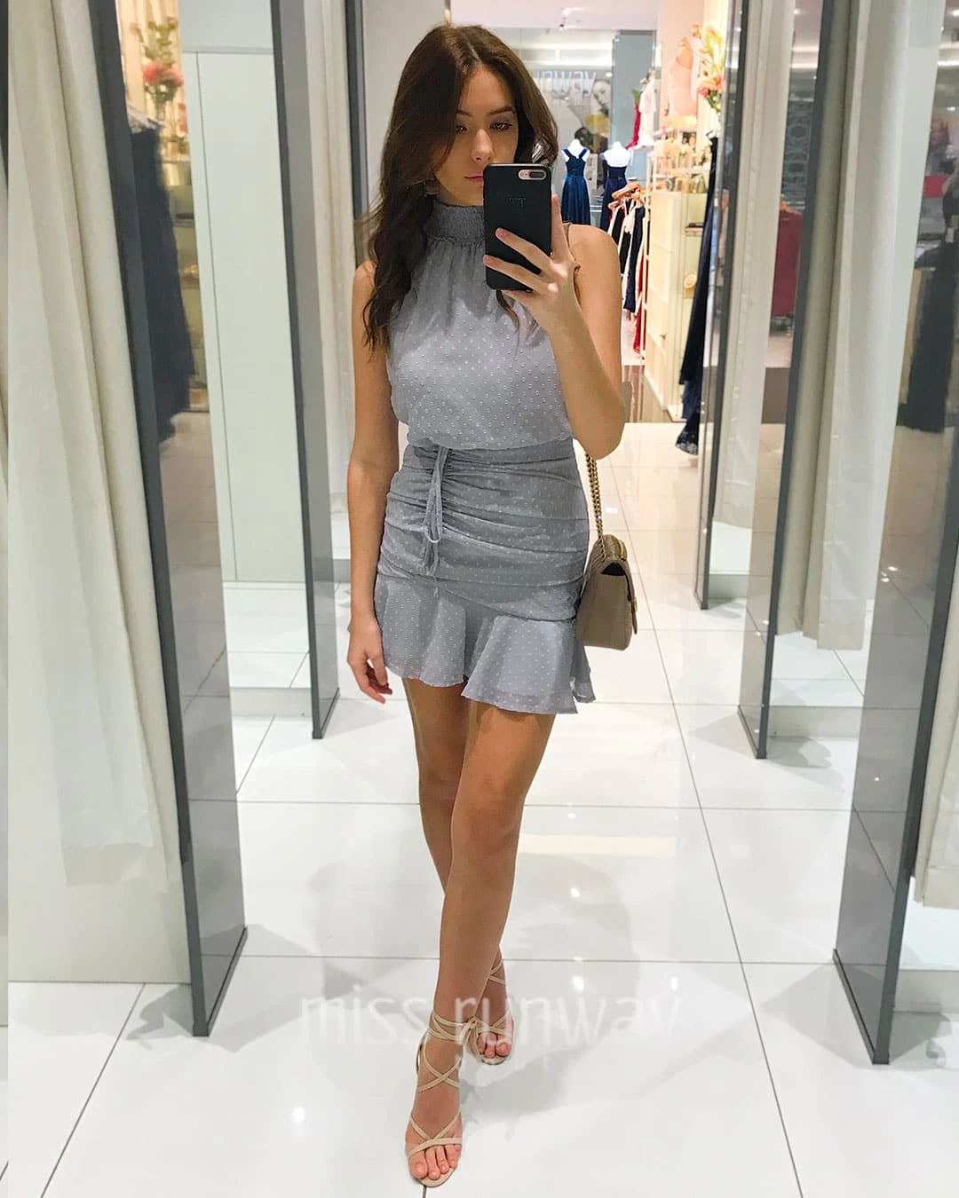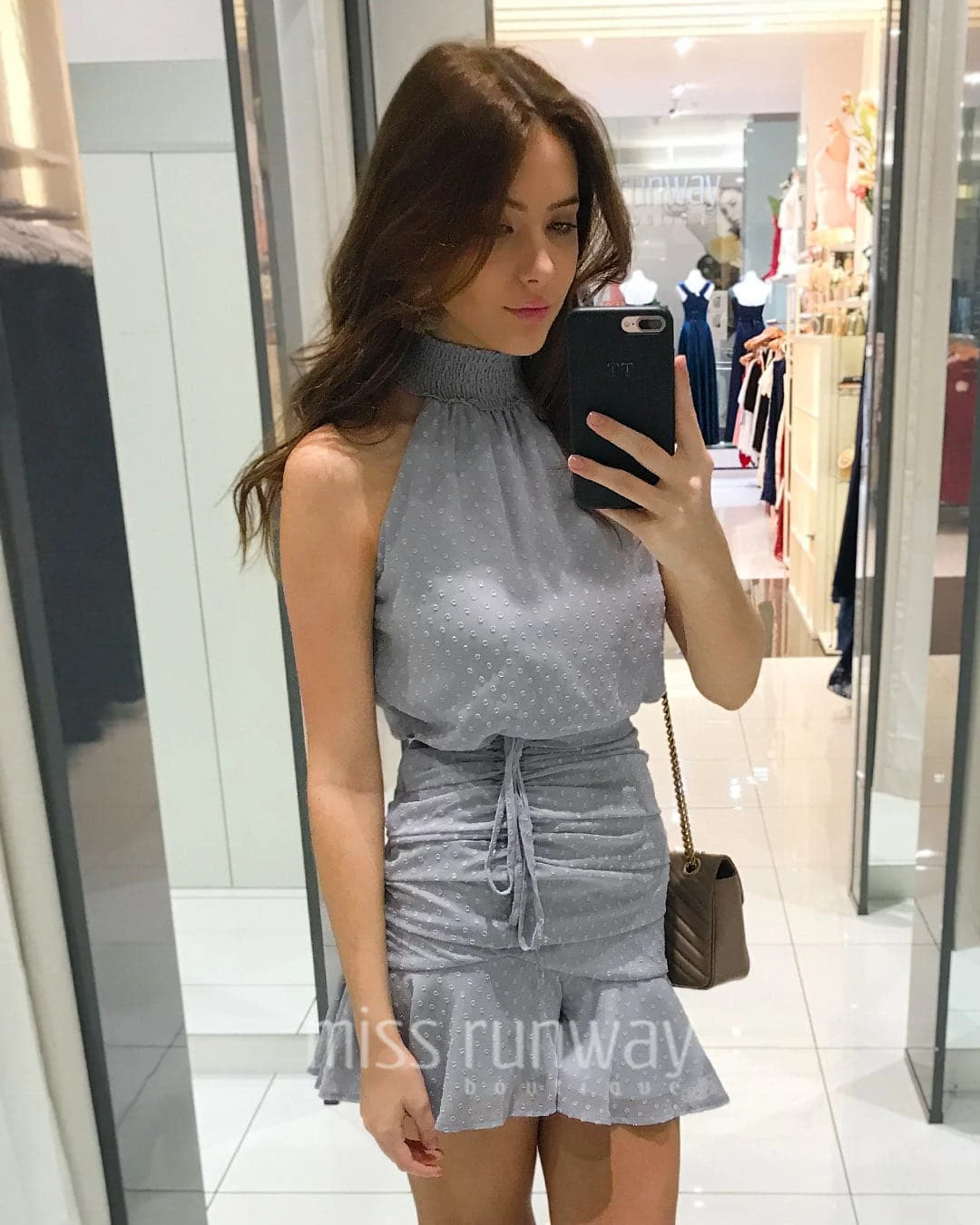 Walk into your next spring event wearing the gorgeous and flattering new Pip Dress. A sleeveless version of our the ever popular Piper dress. The super cute dress catches the eye with its ruched bottom and elegant shirred high neck design. The unique textured light weight spotty fabric adds a complete famine touch for any occasion.