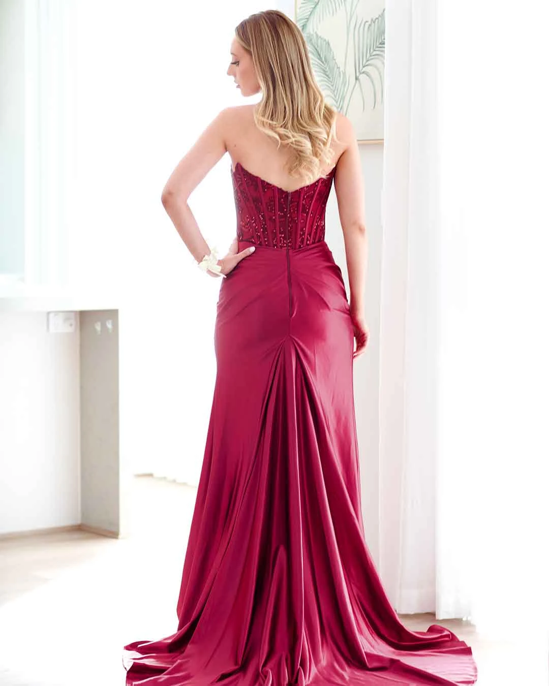 Show off your unique style in the stunning Pixie Corset Lace Gown. Complete with a scoop neckline, 3D lace over the torso, and the fitted silhouette features a ruffle over the hip and a side slit to showcase your curves. Feel your most confident at your next big event in this strapless jersey satin gown.Â