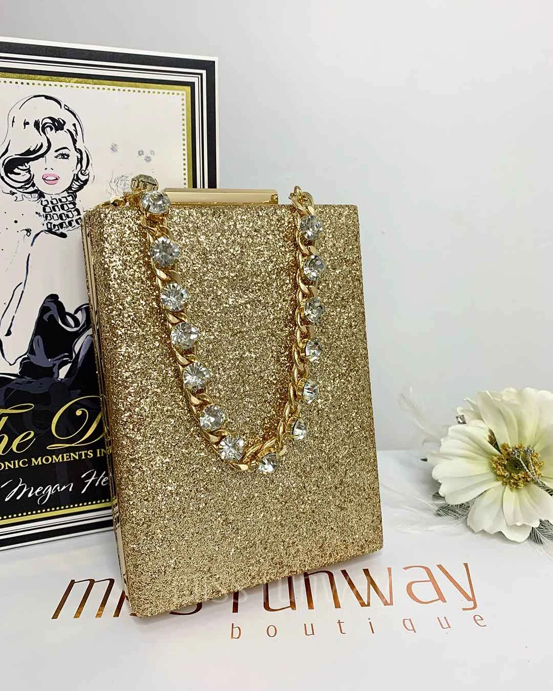 Finding the perfect accessories to set off your outfit doesn’t have to be a struggle. Our Sandy Glitter Clutch is a staple which is timeless. This quality clutch features a modern vertical box design big enough to hold your plus size phone and the girly essentials for a great night out. The removable jewel wrist strap adds the perfect finishing touch. Also comes with a detachable chain shoulder strap.Â